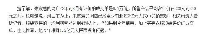 大三曾在新西兰奥克兰大学留学。这是一所很流弊的学校啊,世界排名前50。一边留学,一边开网店,朱宸慧大三和同学一起经营女装网店,三年多时间就已经是金冠店铺,已创下了两亿以上的收益,收入比范冰冰还高。