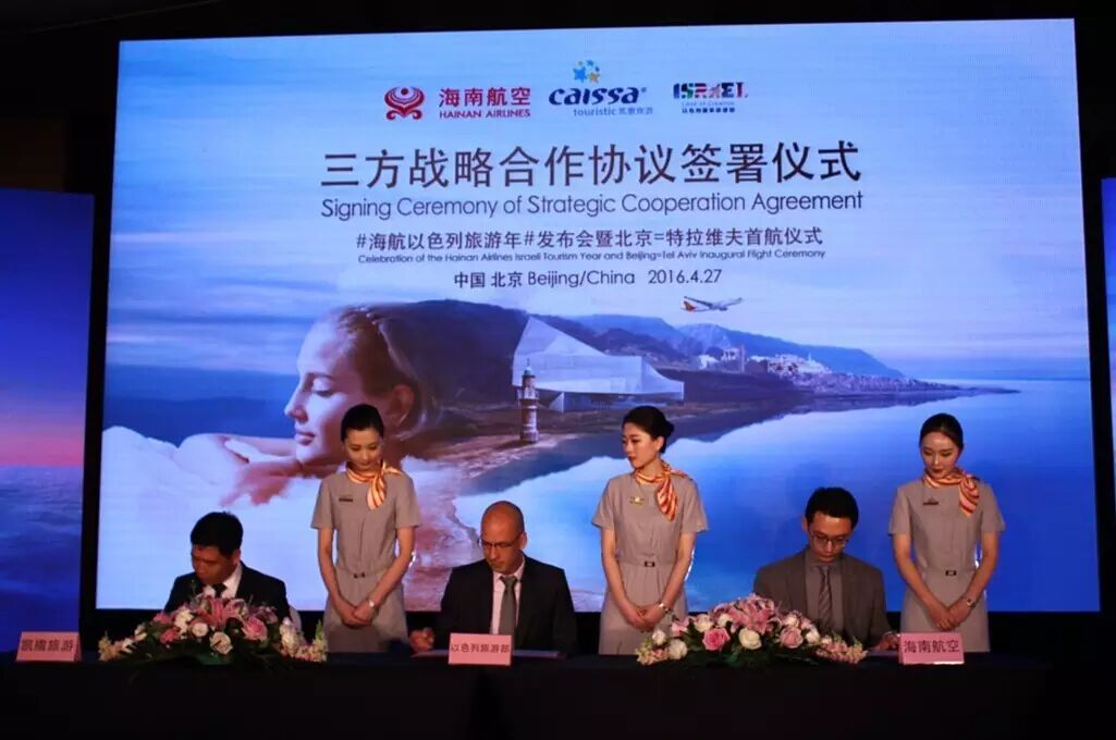 当天,以色列旅游部、海南航空、凯撒旅游代表共同签署了合作战略协议,三方表示,将进一步加强合作,将今年作为“海航以色列旅游年”,重点打造丰富多彩的个性化旅游产品,为两国人民提供更好的出行选择。