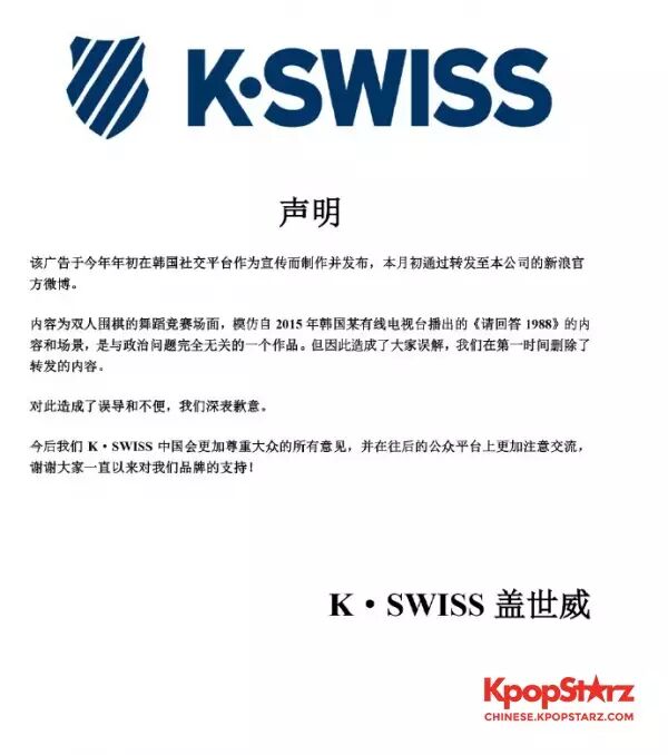 "万里长城"代表着什么不言而喻。今日,视频中该品牌通过微博发布了官方立场,声称:"内容为双人围棋的舞蹈竞赛场面,模仿自2015年韩国某有线电视台播出的《请回答1988》内容和场景,但因此造成大家的误解,我们在第一时间删除了转发内容,对此造成误解和不便,我们深感歉意。"该声明中还表示广告本身与政治立场无关。