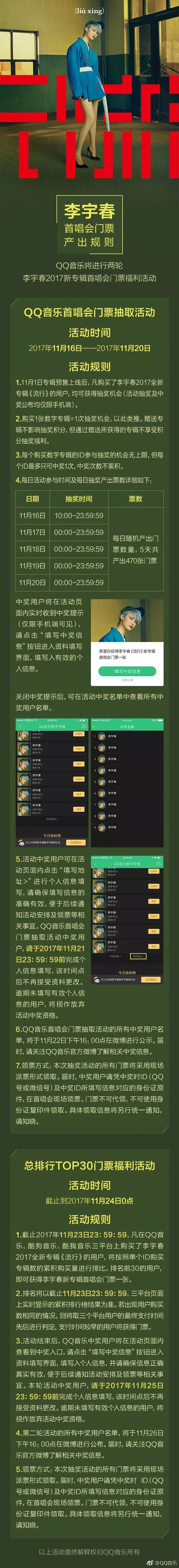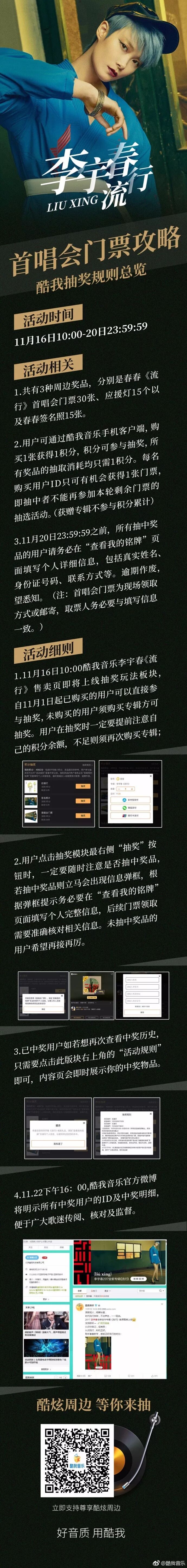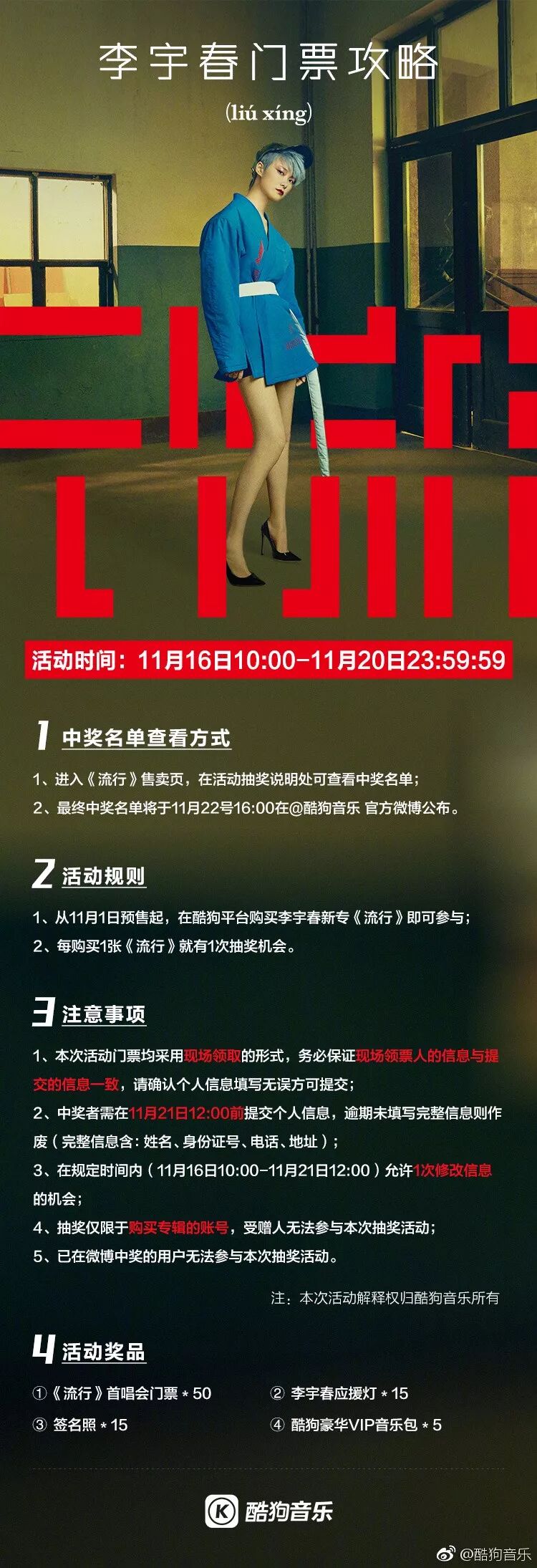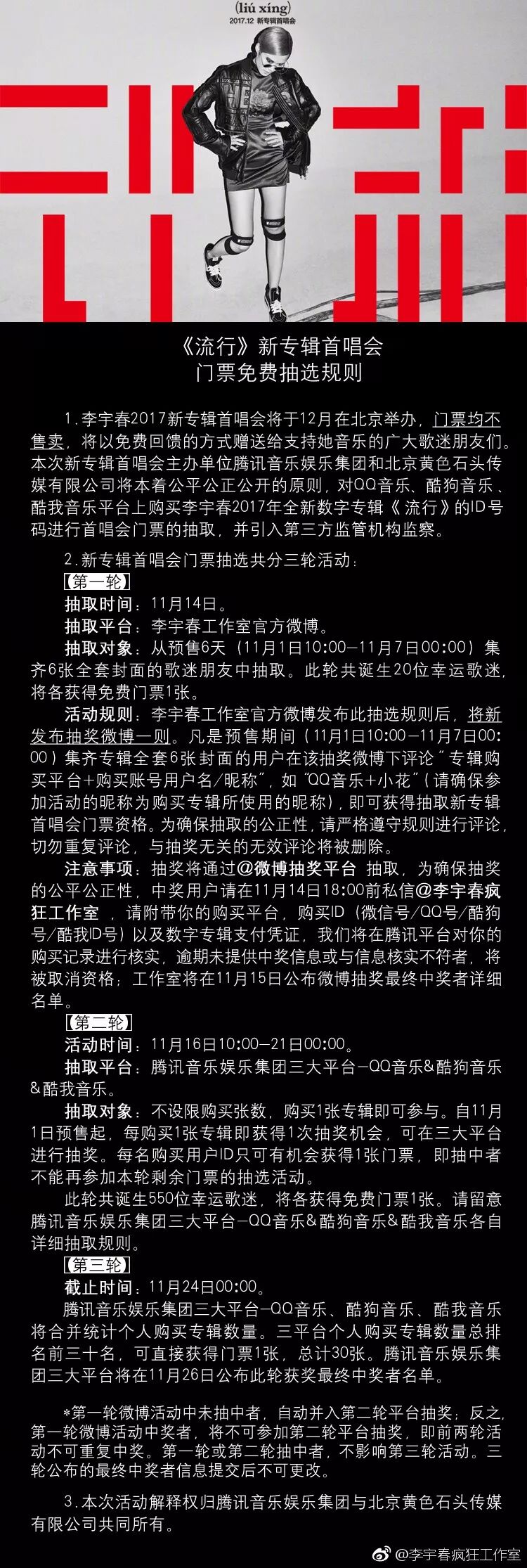 11月16日,“李宇春新专辑首唱会”门票抽取第二轮,将在“QQ音乐”、“酷狗音乐”、“酷我音乐”三大平台开启。只要购买李宇春最新专辑《流行》,即可参与首唱会门票抽奖,还有春春亲笔签名照和精美应援灯等奖品等你哦!快去购买吧!(小编祝大家喜中门票)
