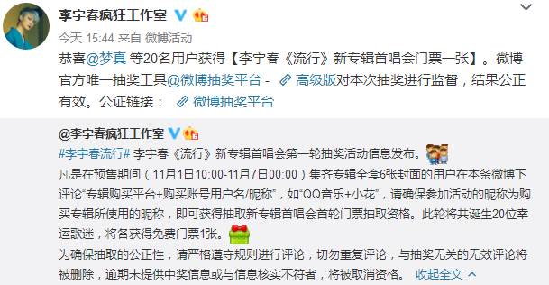 今天下午,李宇春工作室通过官方微博,抽取了20名已已购买李宇春最新专辑《流行》的幸运歌迷朋友,各送出“李宇春新专辑首唱会”门票一张。