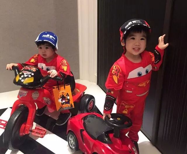 今年已经43岁但相貌仍像20出头的小志,连心境都和现在90后一样,喜欢晒娃“坑娃”。这次女仆游戏,大儿子KIMI没有亮相看来是躲过一劫,双胞胎真是被坑惨了!Jenson和Kyson分别穿着蓝色以及粉红色女仆围裙,衣服上还有大大蝴蝶结,少女感爆棚。