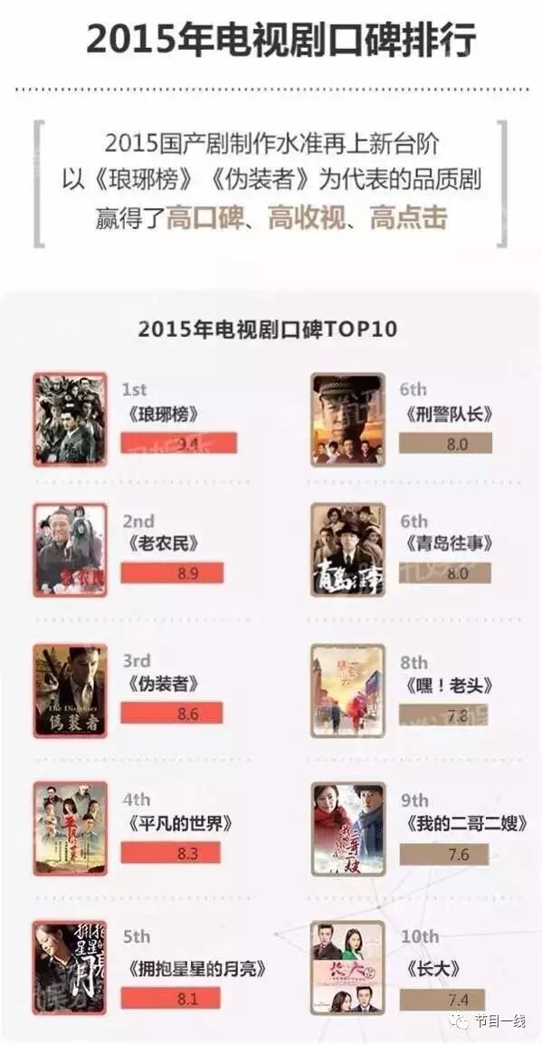 从腾讯发布的“2015年和2016年电视剧口碑排行”榜单来看,2015年国产剧制作水准再上新台阶,2015年以《琅琊榜》《伪装者》《平凡的世界》为代表的优质剧赢得“三高”:高口碑、高收视、高点击,2016年以网络剧《最好的我们》《余罪》为首,《欢乐颂》《小别离》《好先生》《如果蜗牛有爱情》紧随其后霸榜。不难发现,这些口碑剧的共同点都是在讲好故事的“良心剧”。有内容有匠心才能有口碑,而品质的提升也大幅度拔高了国产剧的水平和身价。