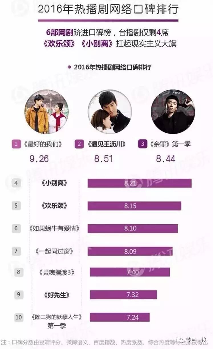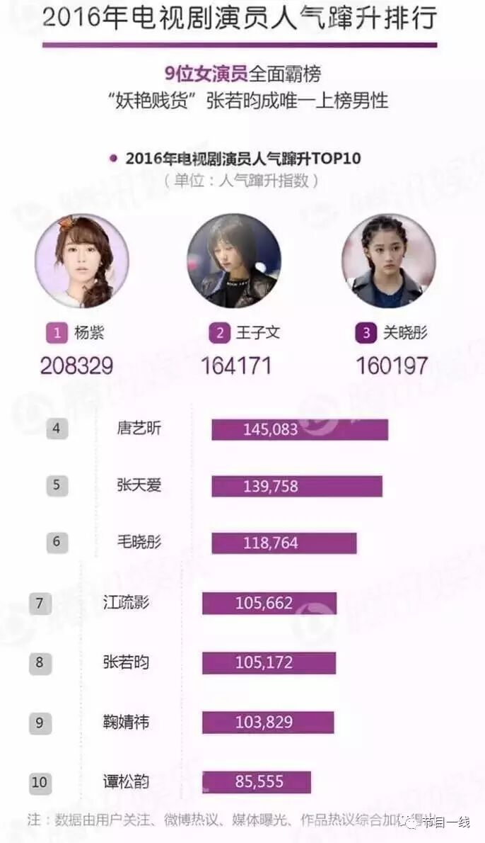 再看《2016年腾讯白皮书》,电视剧《欢乐颂》的火爆荧屏,促使“五美之二”杨紫和王子文霸榜“2016年电视剧演员人气蹿升排行”一、二名,而现象级网剧《太子妃升职记》另“太子妃”张天爱的名字被无数人熟知,最后跻身前五。