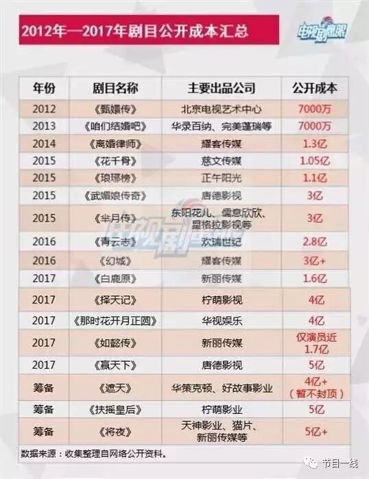 从上图也可看出来,从2012年至今,国产剧成本一路飙高,从“千万元”走向“亿元”时代,5亿元投资的大剧比比皆是。成本的投入大幅度提高,演员片酬也注定只多不少。