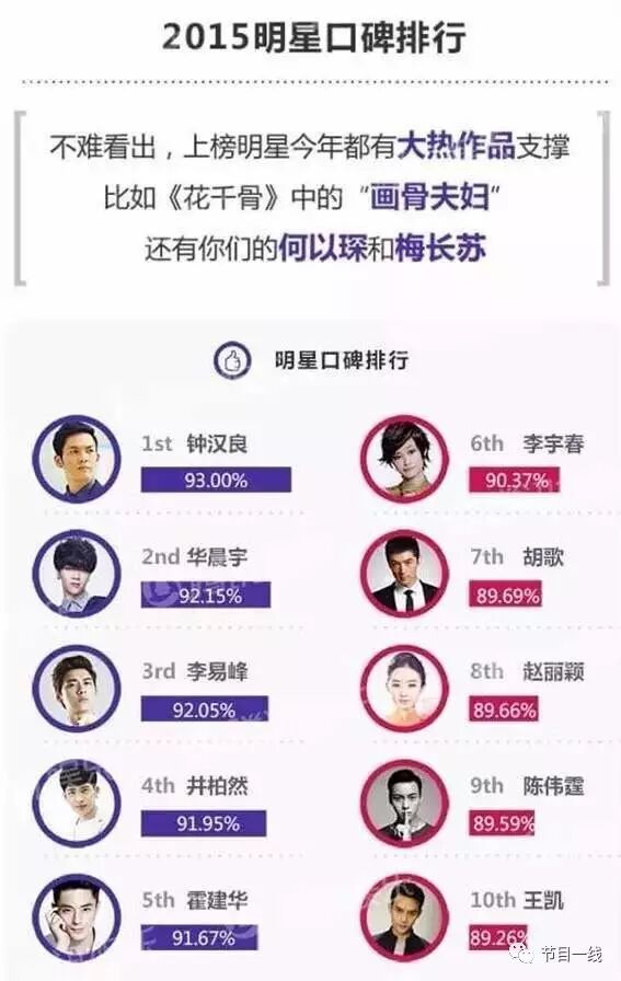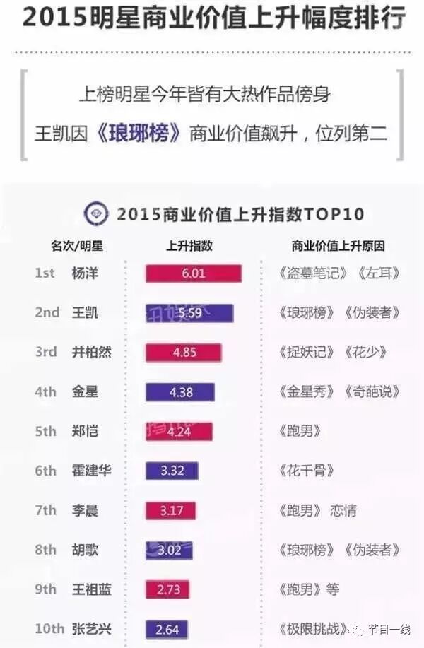 以2015年和2016年为例,在腾讯发布的《2015年腾讯白皮书》之“2015明星商业价值上升幅度排行”类别中,王凯因《琅琊榜》《伪装者》的热播圈粉无数,商业价值飚升位列榜单第二,杨洋凭借大IP网剧《盗墓笔记》收获一票“迷妹”,晋升第一。在“2015明星口碑排行”中,因大热作品《花千骨》而事业再获大丰收的“画骨夫妇”,因《琅琊榜》和《伪装者》再创经典的胡歌都榜上有名。