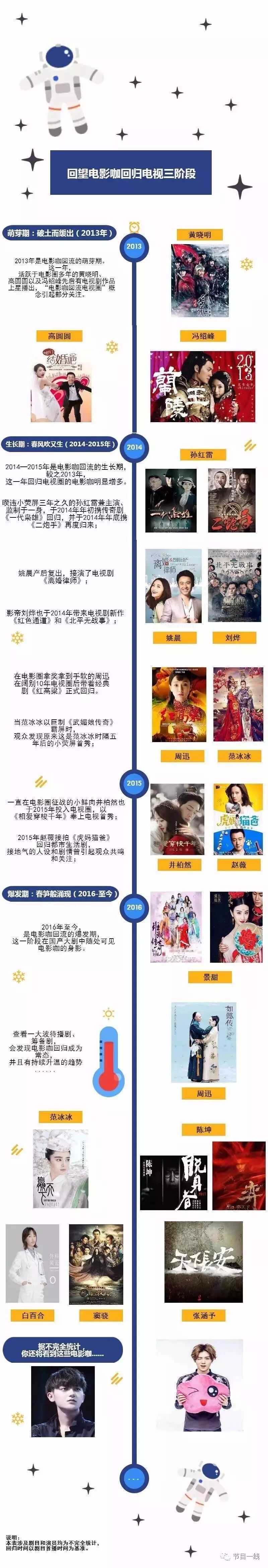 第二阶段:2014至2015年进入了回流生长期,电影咖孙红雷、刘烨、姚晨和电影大花——周迅、范冰冰、赵薇也先后组团回归,吸引了圈内的注意力,并引起较大反响;
