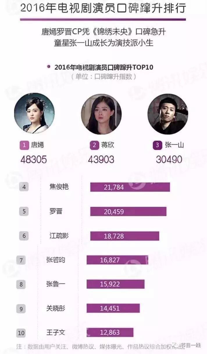 在“2016年电视剧演员口碑蹿升排行”中,唐嫣罗晋凭借大热IP剧《锦绣未央》口碑急升,“五美之一”蒋欣和出演网络IP剧《余罪》而再回观众视野的张一山分列二三。