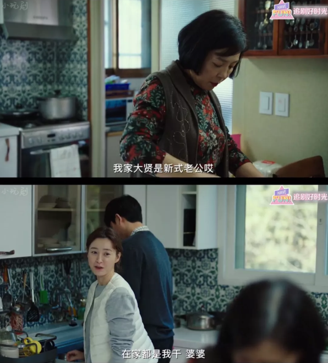 ▲包括金智英的丈夫,客观说也是很好的丈夫,站在她的立场,会帮助做家务,在母亲一再质疑金智英的时候,会站出来反驳