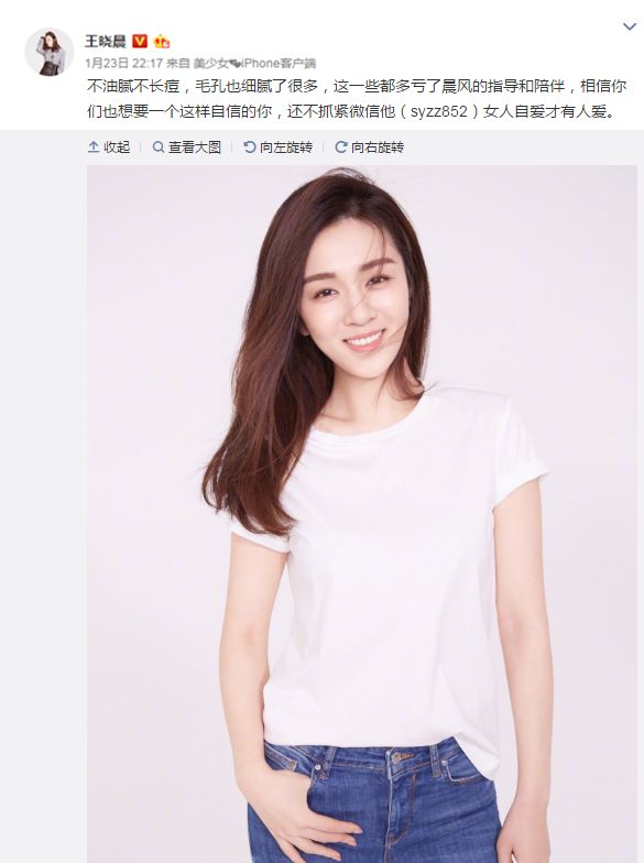不得不说王晓晨的颜值真的是非常高,白皙水嫩的皮肤,不油腻也不长痘,就像下面图片说的一样。