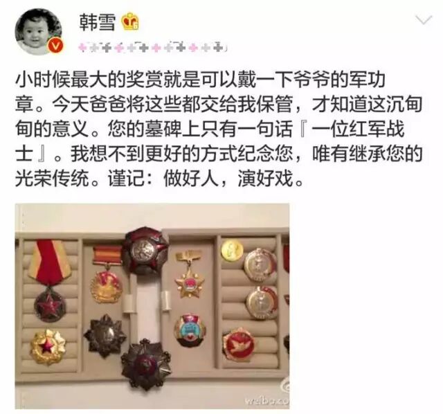 2004年,一条纪念爷爷的微博,16枚彰显卓越军功的奖章,韩雪的“红色背景”瞬时间引来网友热议。