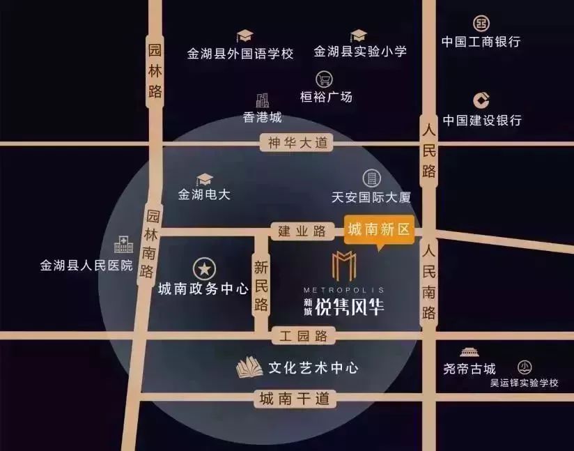新城·悦隽风华位于金湖县城南新区人民南路与建业路交汇处,属城南政务中心区,是政府重点规划发展方向;西侧和南侧毗邻县人民医院、在建的金湖政务中心和文化艺术中心等配套,东南侧紧邻知名旅游地产项目尧帝古城和吴运铎实验学校,未来区域升值潜力无限。