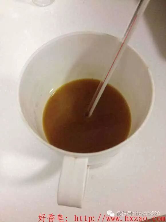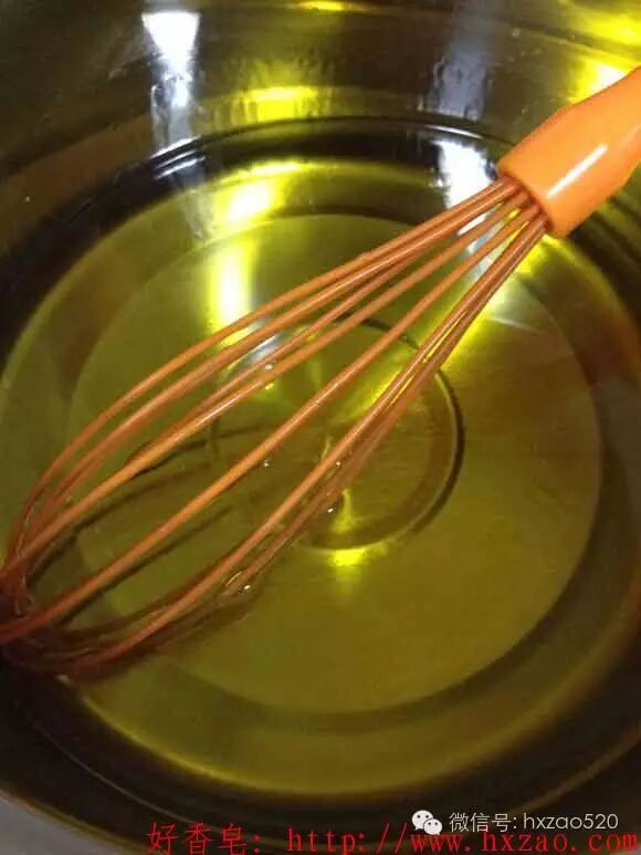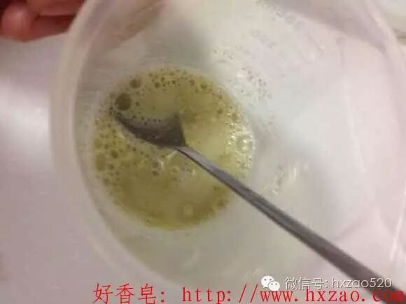 然后将溶好的薄荷碱液以少量多次的方式倒入油脂中,倒入后就开始不断的搅拌