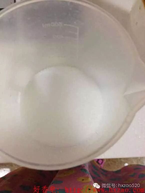 将称量好的碱慢慢的倒入冰冻的薄荷水中,在倒入的时候尽量采取少量多次的方法,倒入一点后就开始搅拌,直到完全熔化;溶化后我们将温度控制在40°左右