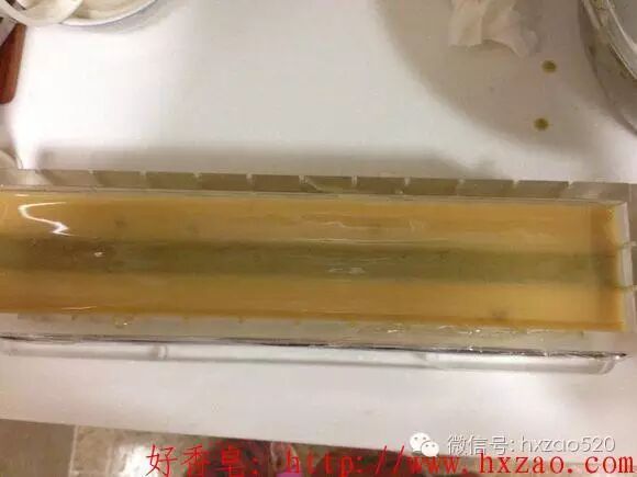 将皂液倒入带有隔离层的模具中,拿掉隔离层后制作出来的就是分层的皂