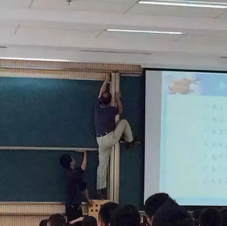 还有这位重庆大学工程机械的高春林老师,走进教室看到滑动黑板边框滑轮卡住,便直接踩黑板,一分钟修好,不愧是教工程机械的!