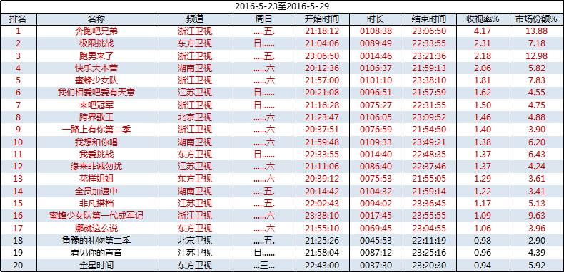 综艺栏目收视:本周共有17档节目收视破1%,浙江卫视《奔跑吧兄弟》、东方卫视《极限挑战》占据前两位;
