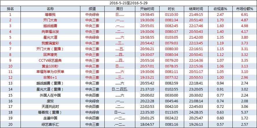 综艺栏目收视:本周共有12档节目收视破1%,中央综合《等着我》和中央三套《开门大吉》占据前两位;