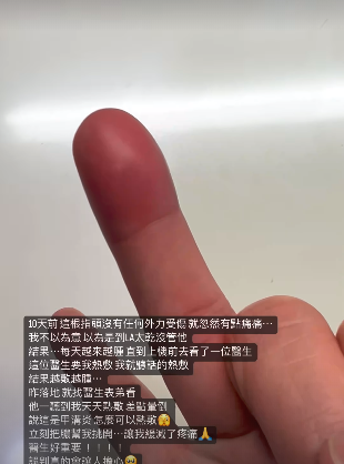 从贾静雯曝光的画面中能够看出,她的右手无名指依然红得发紫,肿得非常厉害,比其他正常手指大出一圈,并且还能看见发黄的脓液淤积在皮肤下。