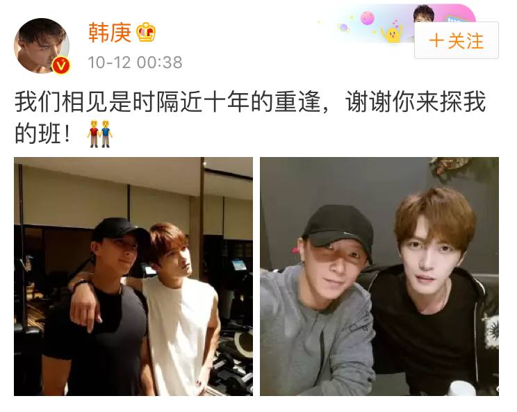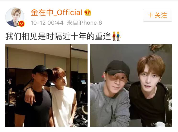 过了一会,金在中就在自己的ins上晒出两张和韩庚的合照,还特地用中文配字:我们相见是时隔近十年的重逢。