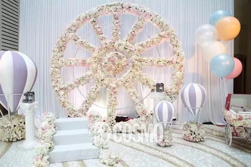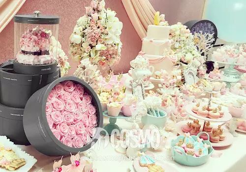 除了两人对小醒醒的爱意让人感动,现场的装扮更是温馨可爱下足心思。粉白两色装点了现场每个角落,而小醒醒的生肖“羊”的元素也是随处可见。