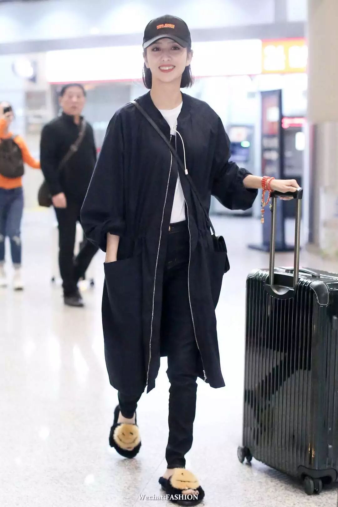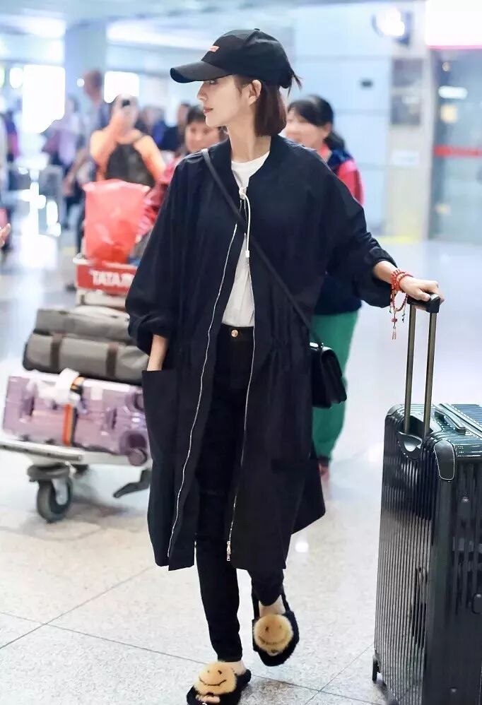 佟丽娅现身机场,身穿Barena Venezia外套,搭配Hermès单肩包和Anya Hindmarch毛毛拖鞋,简单舒适。