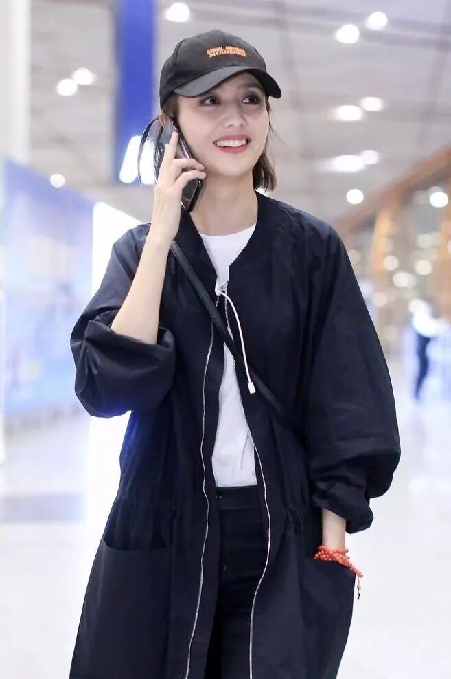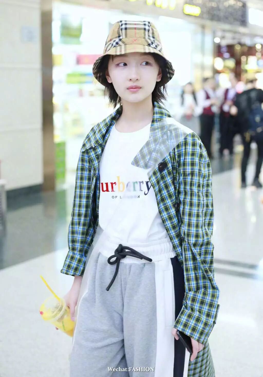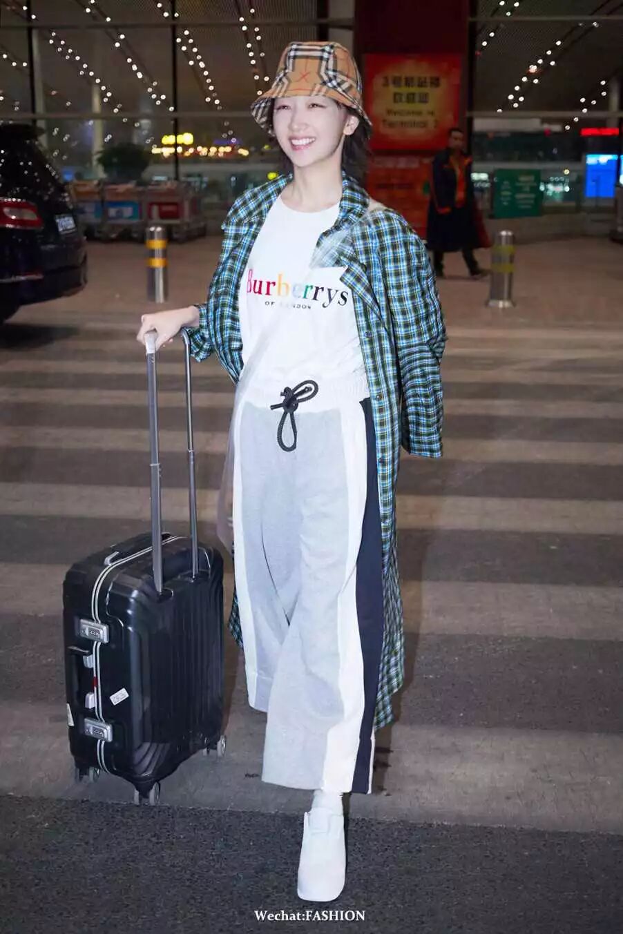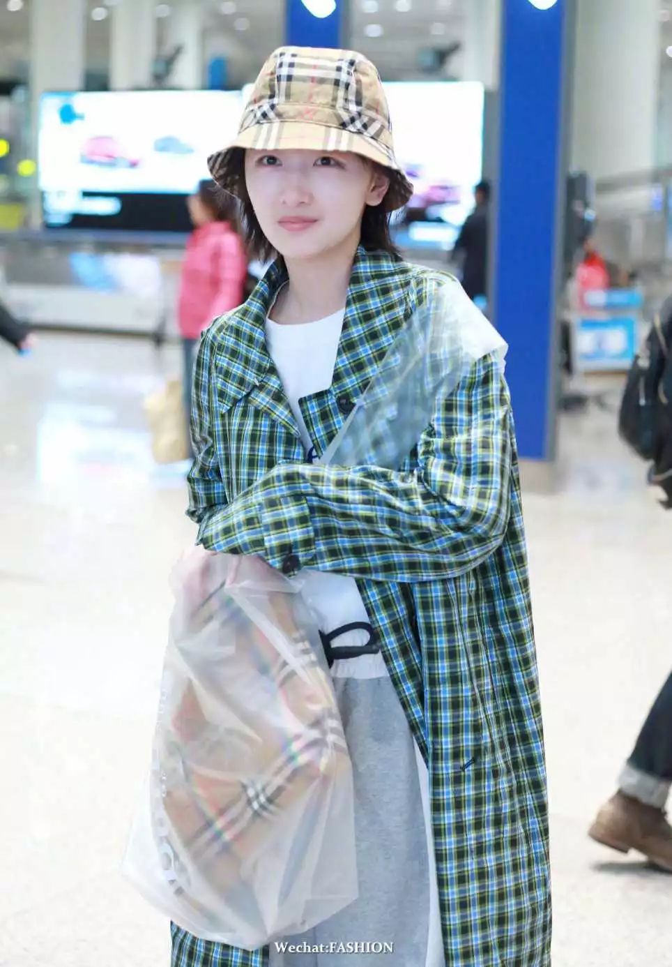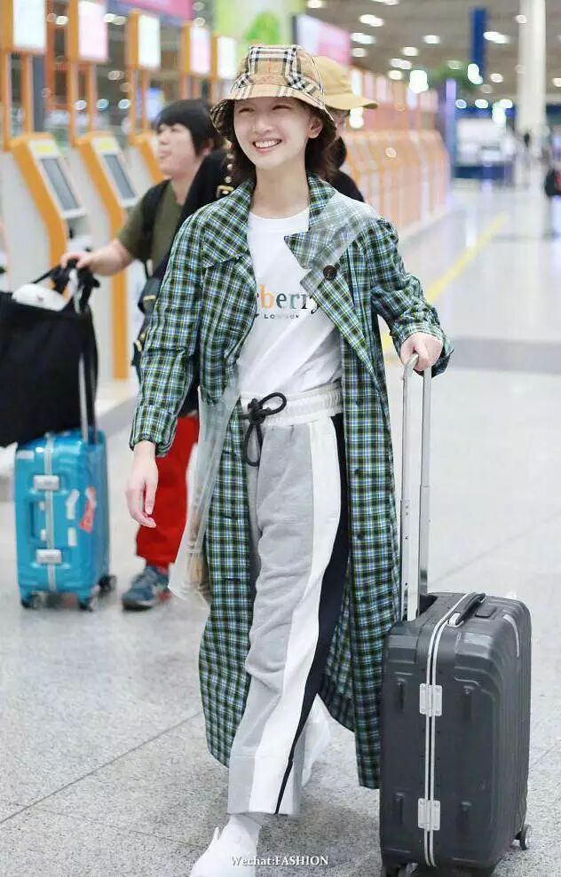 周冬雨最新机场照,sloganT恤搭运动裤,外搭格纹长外套,头戴格纹渔夫帽,超灵气的Burberry girl。