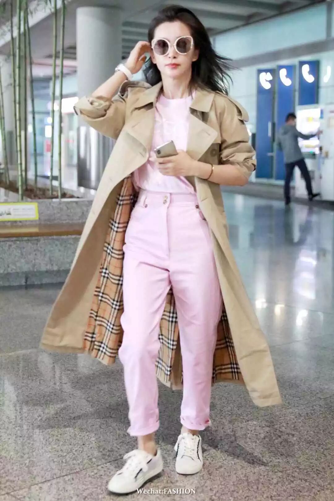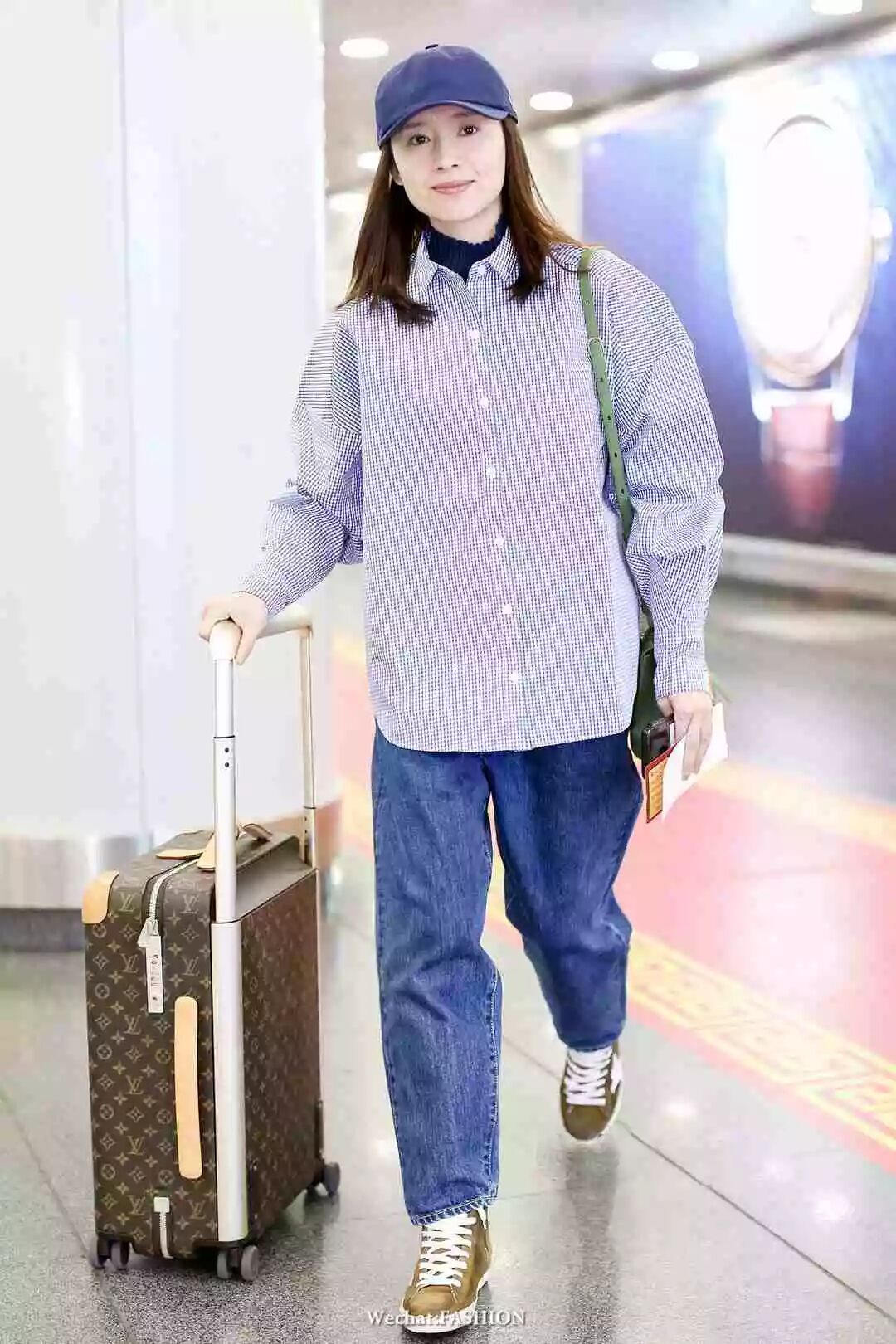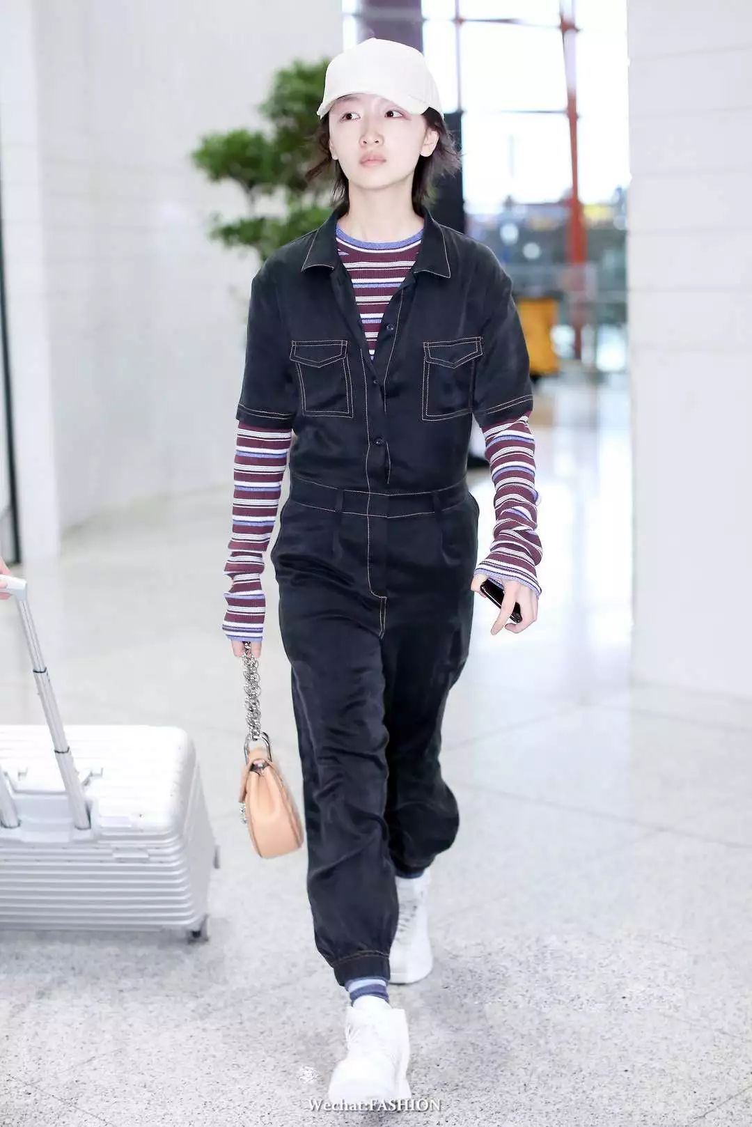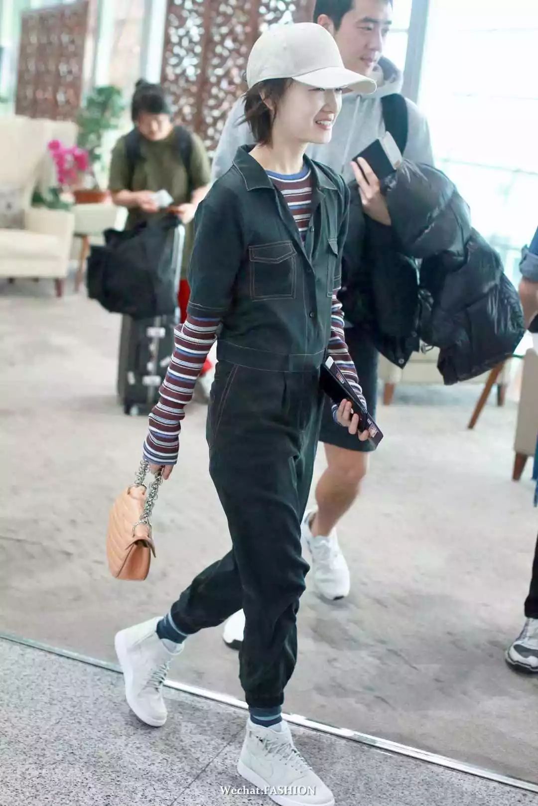 周冬雨最新机场照,sloganT恤搭运动裤,外搭格纹长外套,头戴格纹渔夫帽,超灵气的Burberry girl。