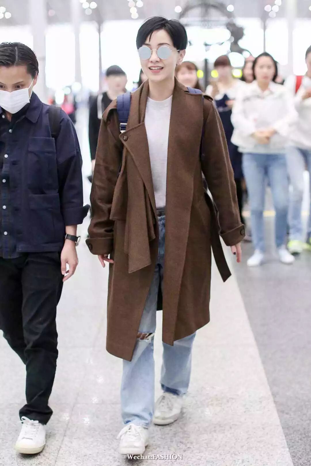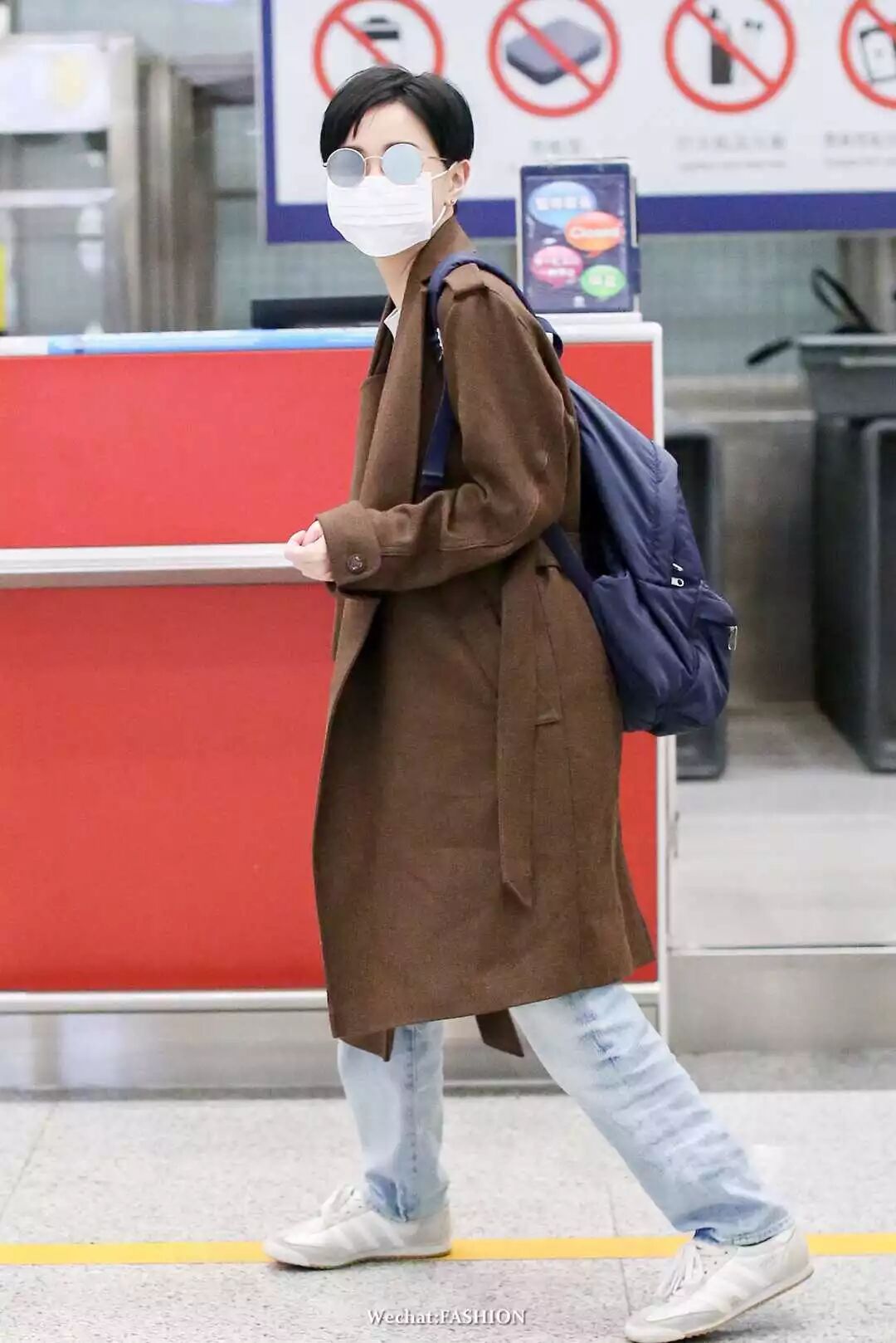 董洁另一身机场look,Shushu/Tong oversized 条纹衬衫条纹衬衫搭宽松的牛仔裤,脚踩Golden Goose Deluxe Brand运动鞋,简单舒适。