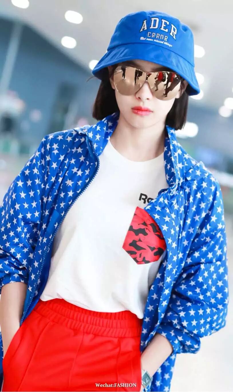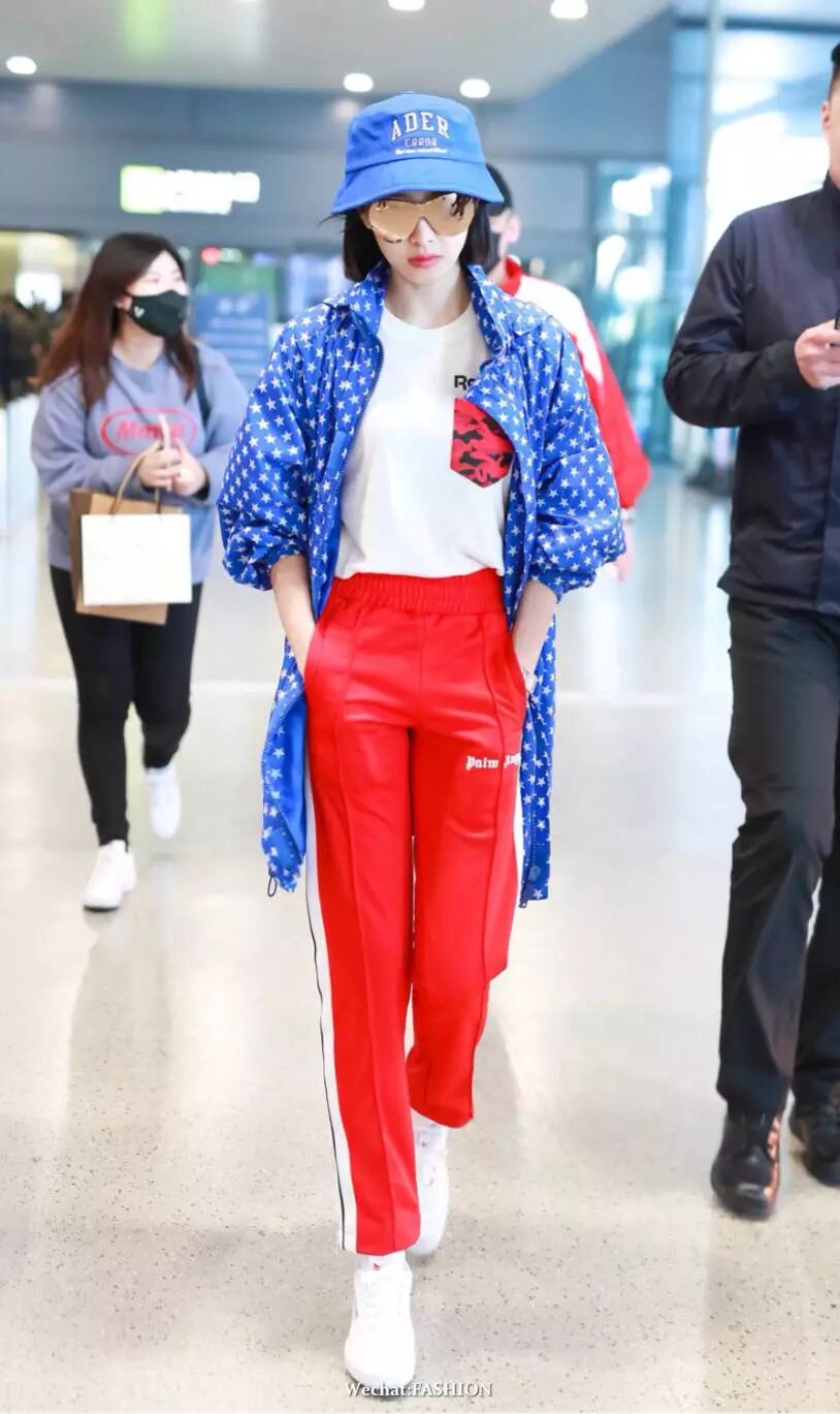 宋茜现身机场,Ader Error 渔夫帽休闲复古,身穿Givenchy星星印花外套吸睛时髦,Palm Angels红色运动裤出挑有活力,Reebok小白鞋轻松点缀活力,小姐姐玩起撞色风也这么帅气。