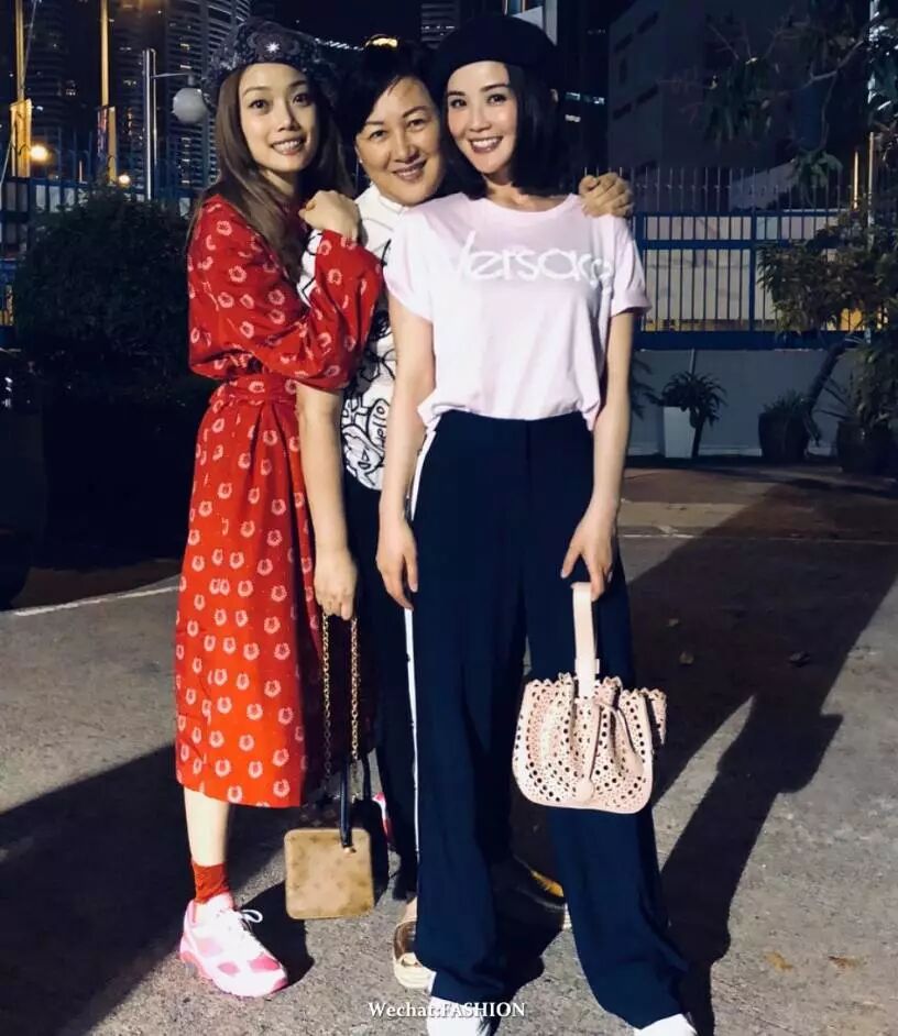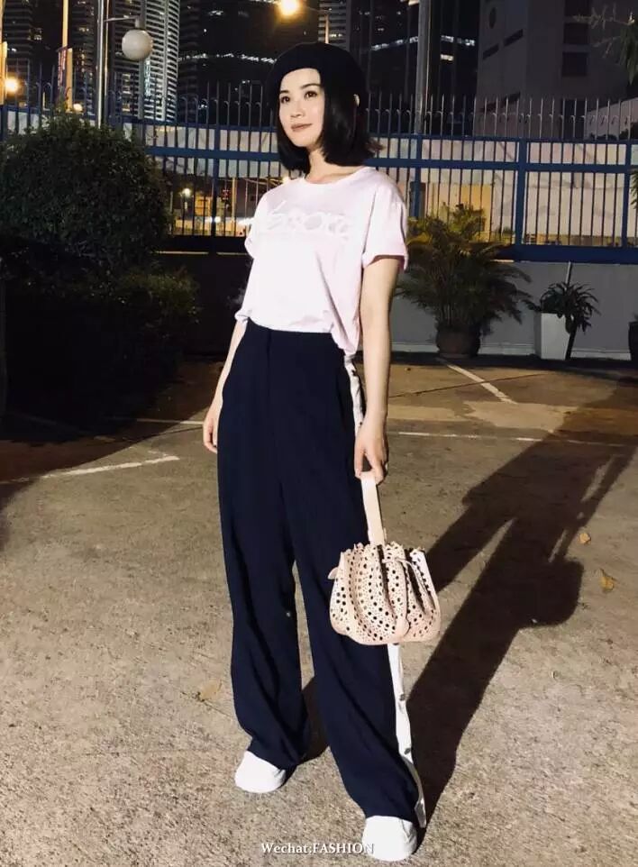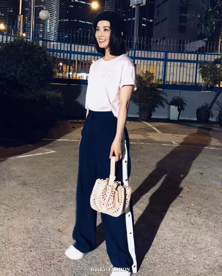 蔡卓妍最新私服照,身穿Versace 2018春夏系列粉色T恤,搭配运动长裤和小白鞋,手拎Alaia镂空锦囊包。