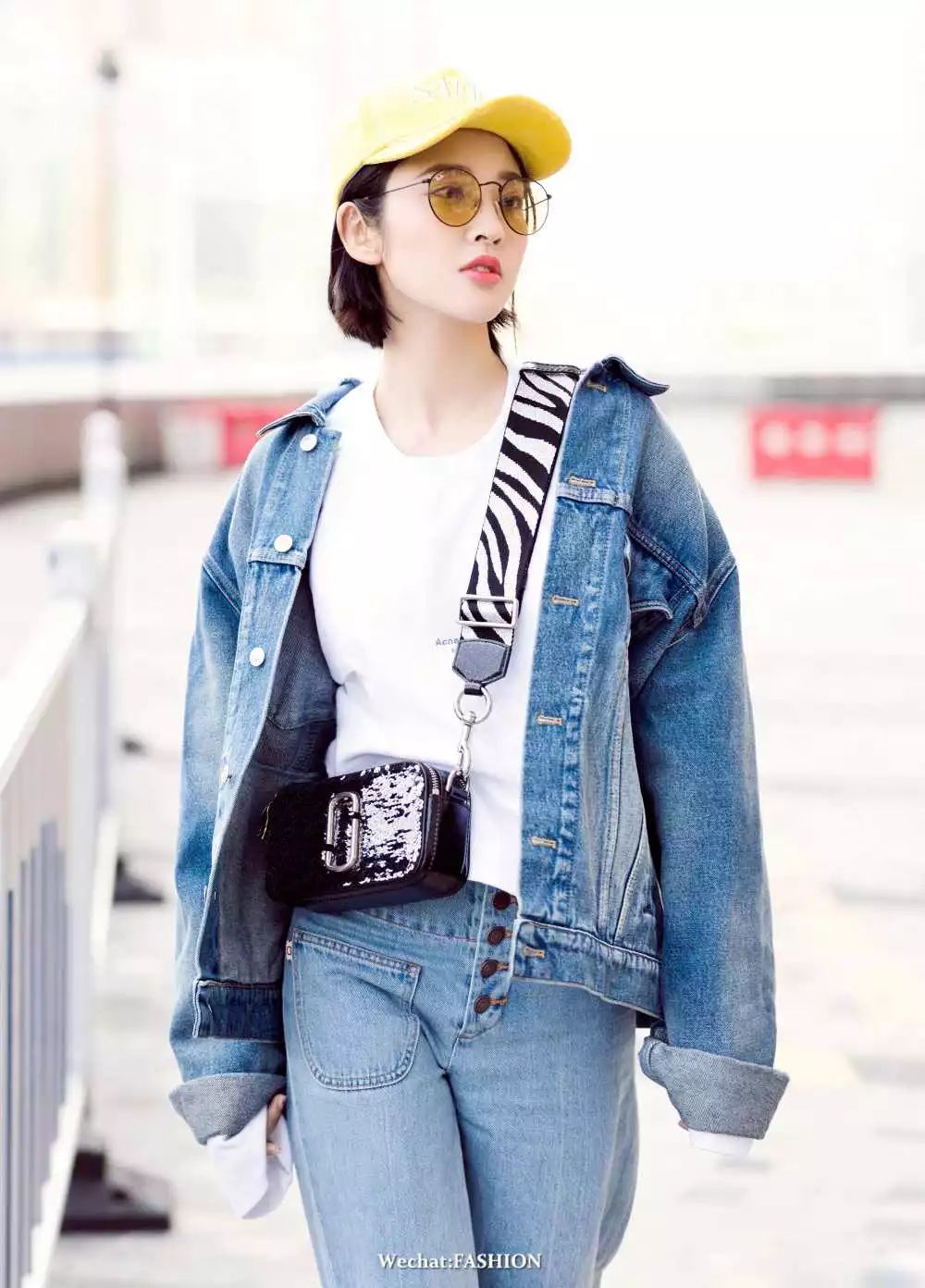 唐艺昕身着街头感十足的Balenciaga牛仔外套,搭配Marc Jacobs的牛仔阔腿裤轻潮出镜,活力满分,SMFK帽子与同色系墨镜使得整体看起来非常清爽,透露着满满春天的味道。