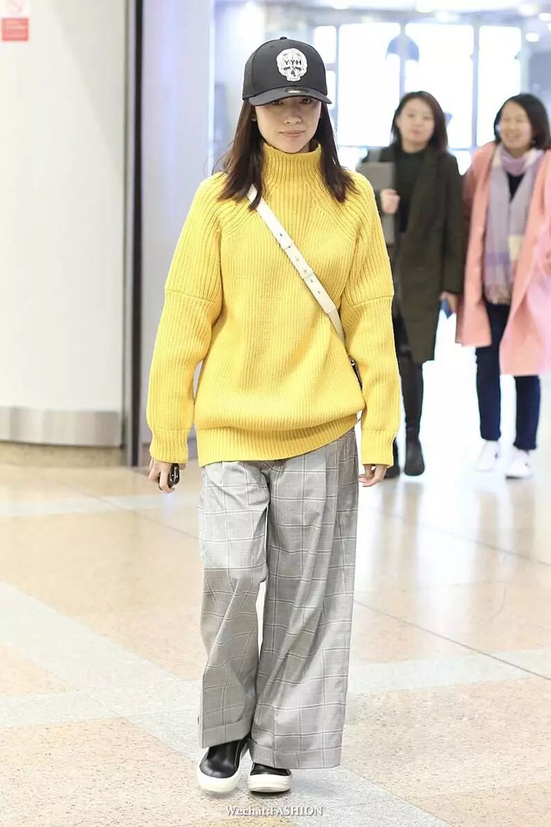 董洁oversized亮黄色高领毛衣搭灰色格纹阔腿裤,董洁私下很喜欢宽垮的舒适搭配,她上周的两身出街Look都是这种风格。