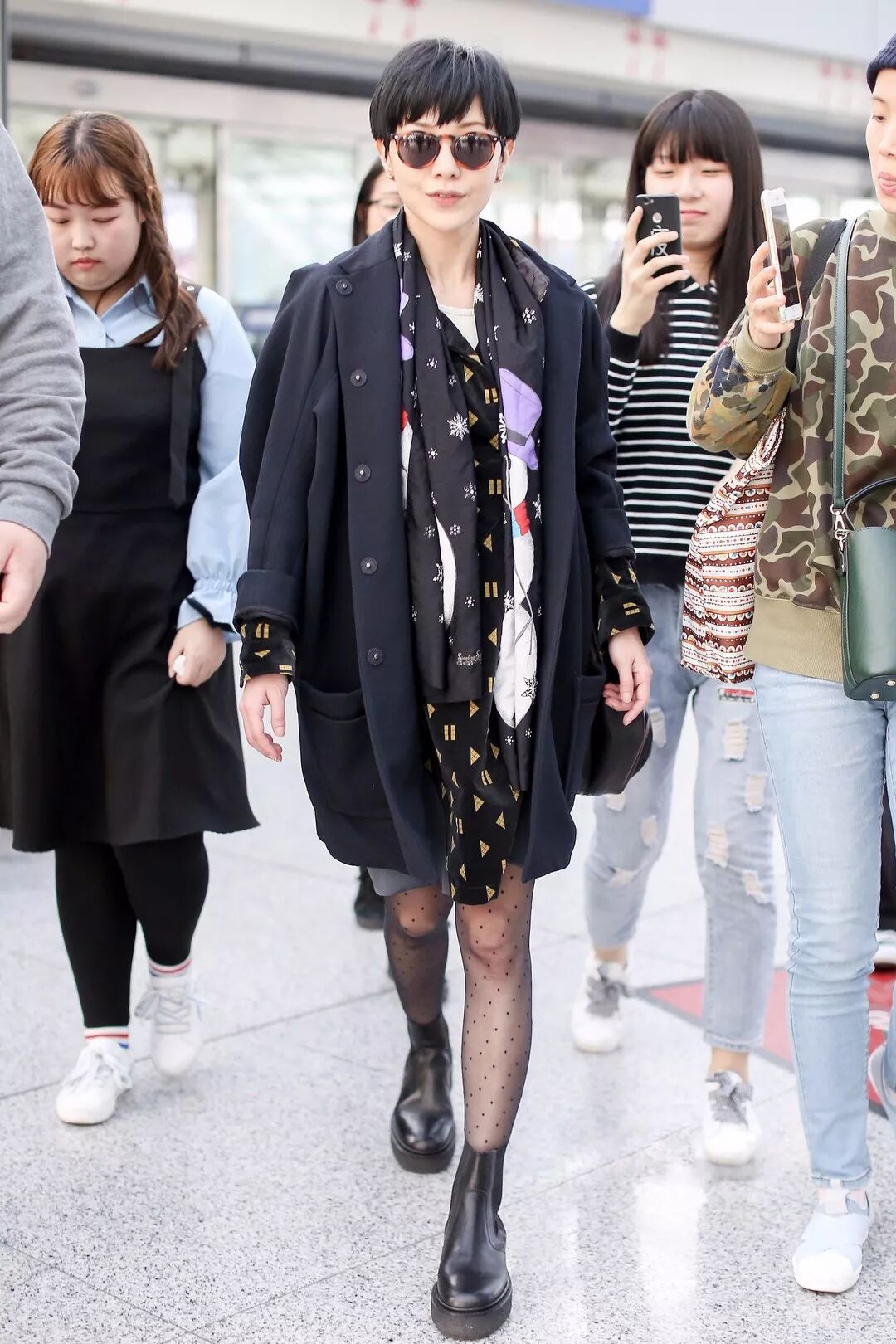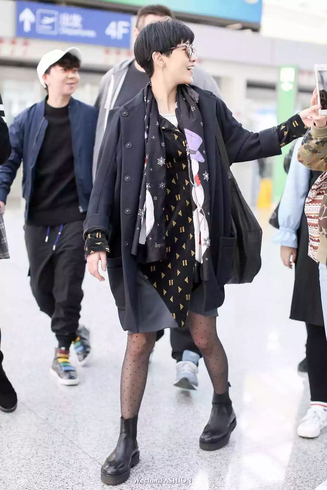 郭采洁有两组街拍,两身私服搭配风格截然不同,这身印花裙搭薄外套,波点leggings+短靴,个性十足。