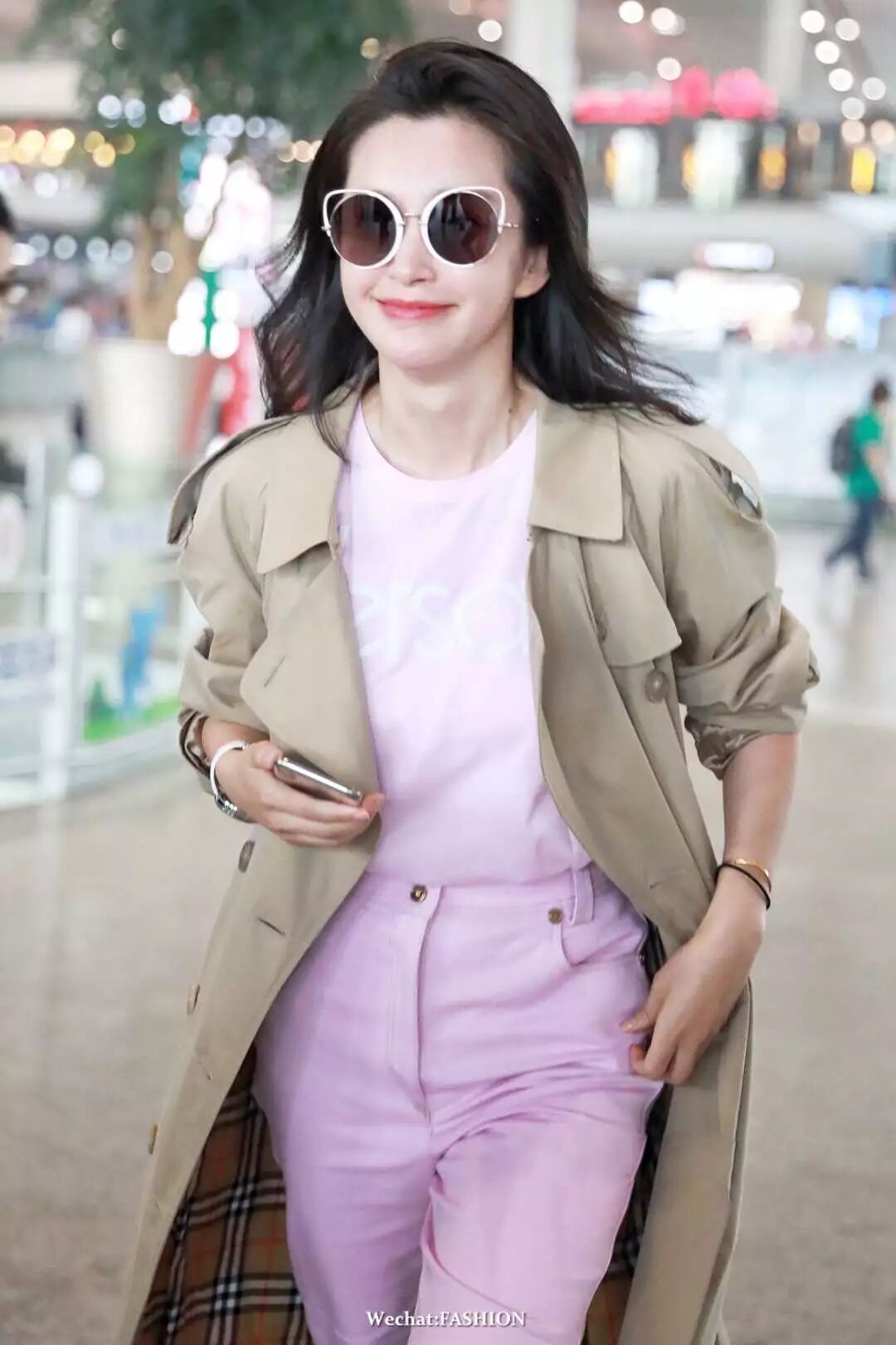 李冰冰现身北京机场,博柏利 (Burberry)风衣内搭范思哲 (Versace)字母印花T恤,这身Look融入了水嫩的粉调,但加入了卡其色风衣的搭配方式更为随性潇洒,很适合她飒爽的形象。