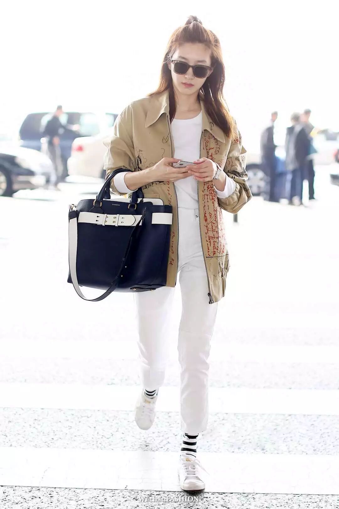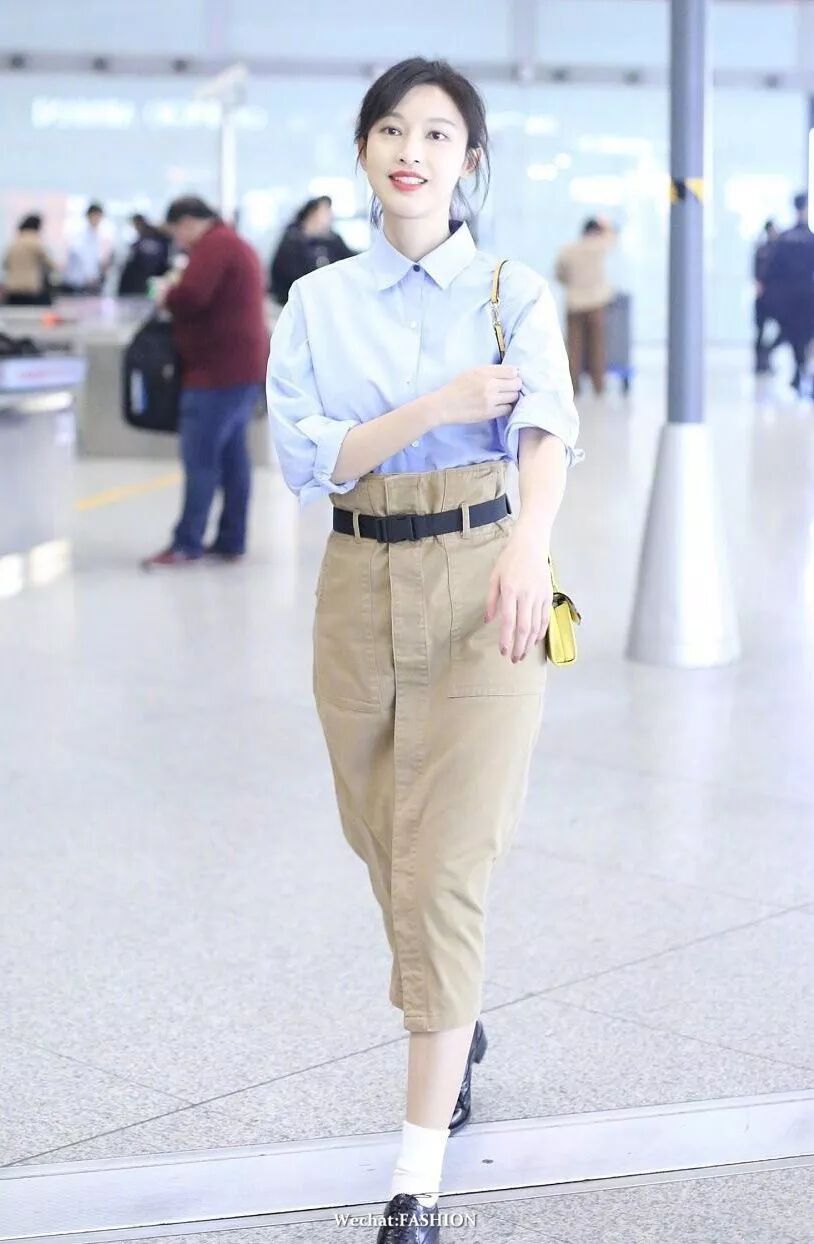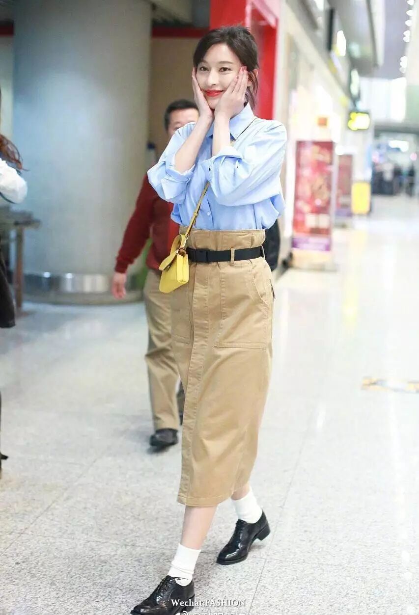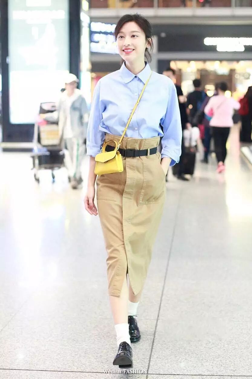 张俪现身机场,蓝色衬衫搭卡其色纸袋裙,包包来自GB-David.