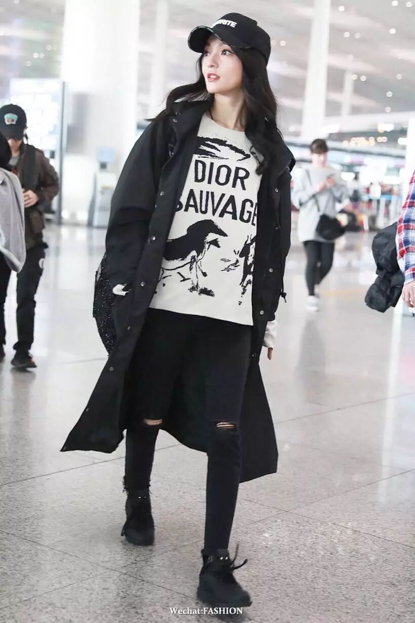 张韶涵北京机场街拍:身着迪奥 (Dior) 印花毛衣,戴维特萌 (Vetements) 字母刺绣鸭舌帽