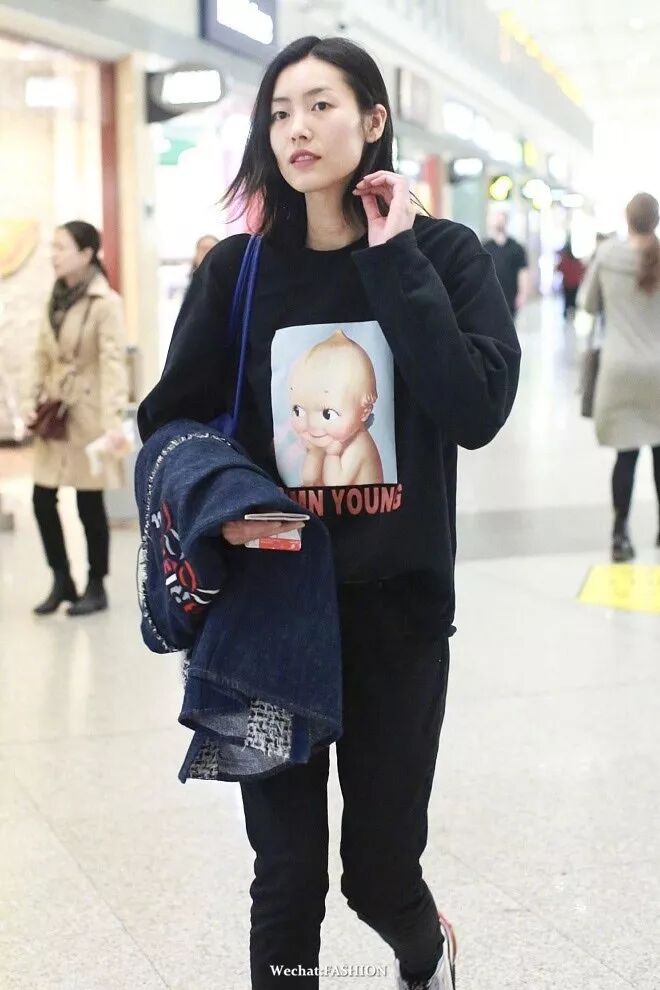刘雯现身机场,mo&co卡通图案卫衣搭黑色裤,简单不失潮流感,永远笑容满面的大表姐!