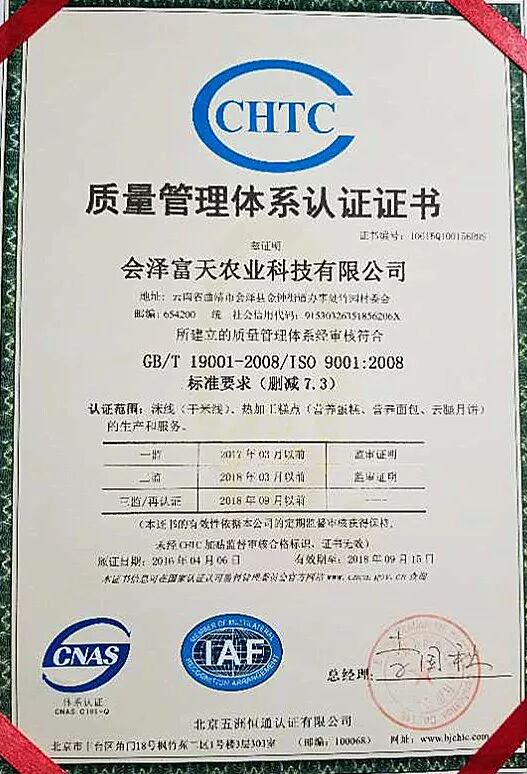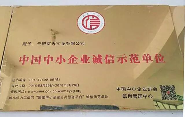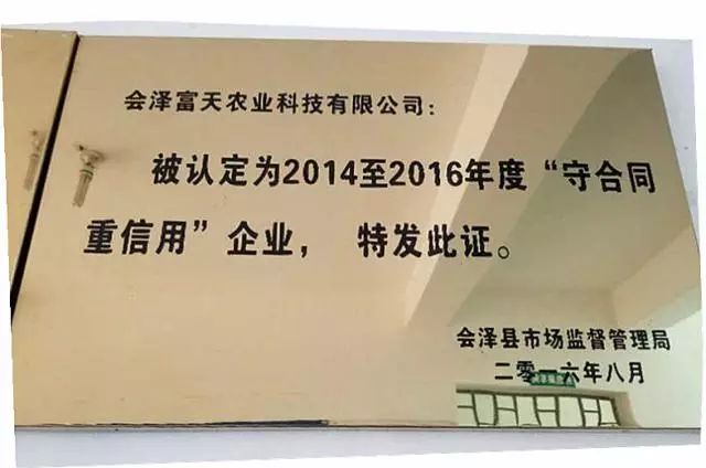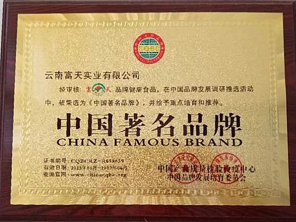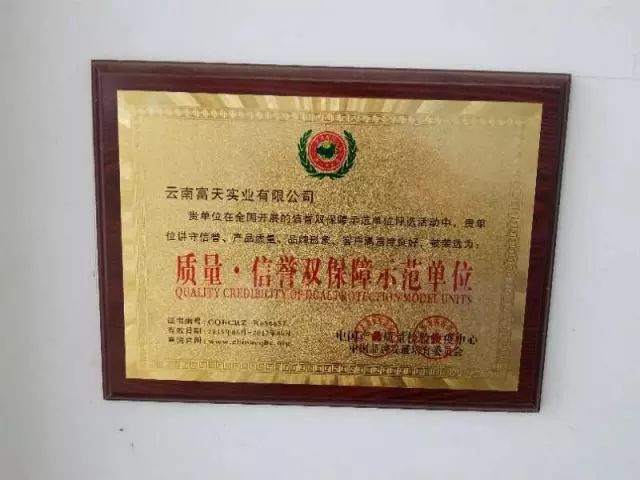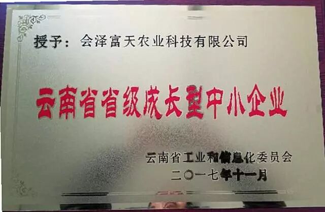 会泽富天农业科技有限公司被“中国企业信用评估管理委员会”“中国产品质量检验检疫中心”“中国品牌发展培育委员会”评为“中国著名品牌”“质量、服务、诚信AAA企业”“中国最具社会责任感企业”“中国质量信誉双保障示范单位”;被中国中小企业协会授予“中国中小企业诚信示范单位” ,被会泽县市场监督管理局认定为“2014至2016年度守合同重信用企业”,被评为“云南农业十大领军企业”,被云南省工商联合会评选为会员单位。公司于2016年通过“22000食品安全管理体系”认证及“9001质量管理体系”认证。