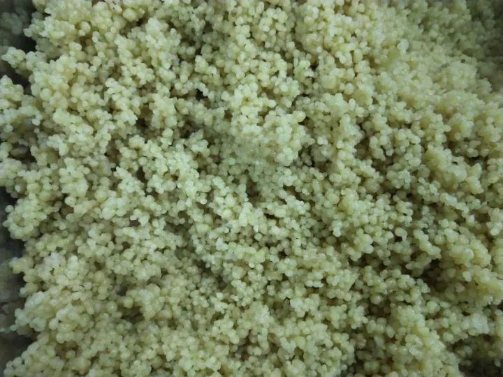3、将面团揉搓成黄豆般大小的粒子,用特别的筛子过滤,将做好的荞疙瘩筛于另一器皿中,较大的粒子再进行揉搓,直到合格为止。然后上甑进行烹蒸,蒸熟后就可食用。