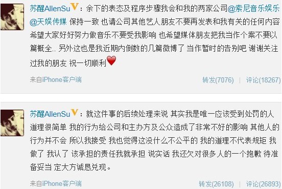 同日,苏醒所在天娱公司也发声明,正式雪藏苏醒,时间为200天。