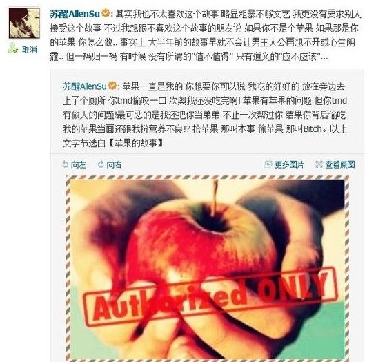 常在河边走,哪有不湿鞋。后来的后来,就被苏醒发现了,然后文绉绉的苏醒发了这么条微博【苹果的故事】。