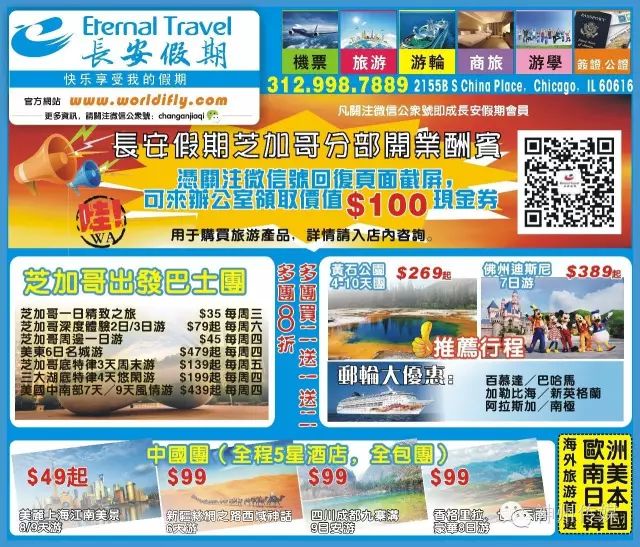 长安假期芝加哥分布开业酬宾,凭关注微信号回复页面截屏,可来办公室领取价值$100现金券