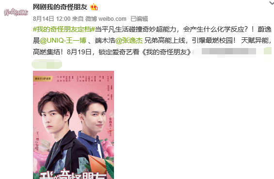 其实,这个愿望已经成真了!8月14日,网剧《我的奇怪朋友》官宣,已定档于8月19日开播。