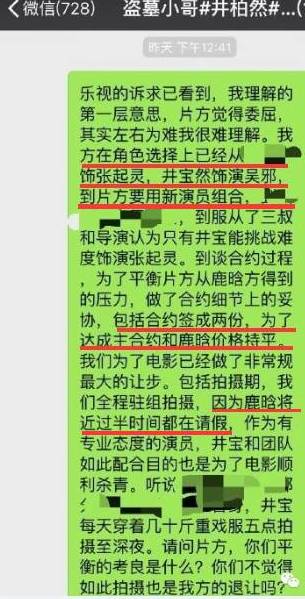 一月份的时候,井柏然的团队突然在微博爆出几张盗墓笔记电影内部聊天截图,后来也删了。