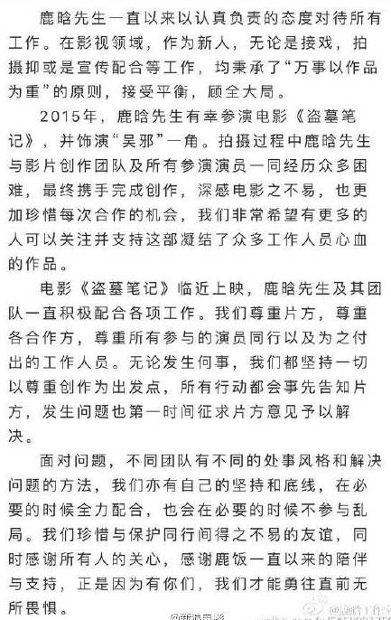 鹿晗那边也紧接着出了声明,直指鹿晗方在拍电影以及后续的事情中,一直抱着尊重作品和演员的态度,关于撕逼我们不约。