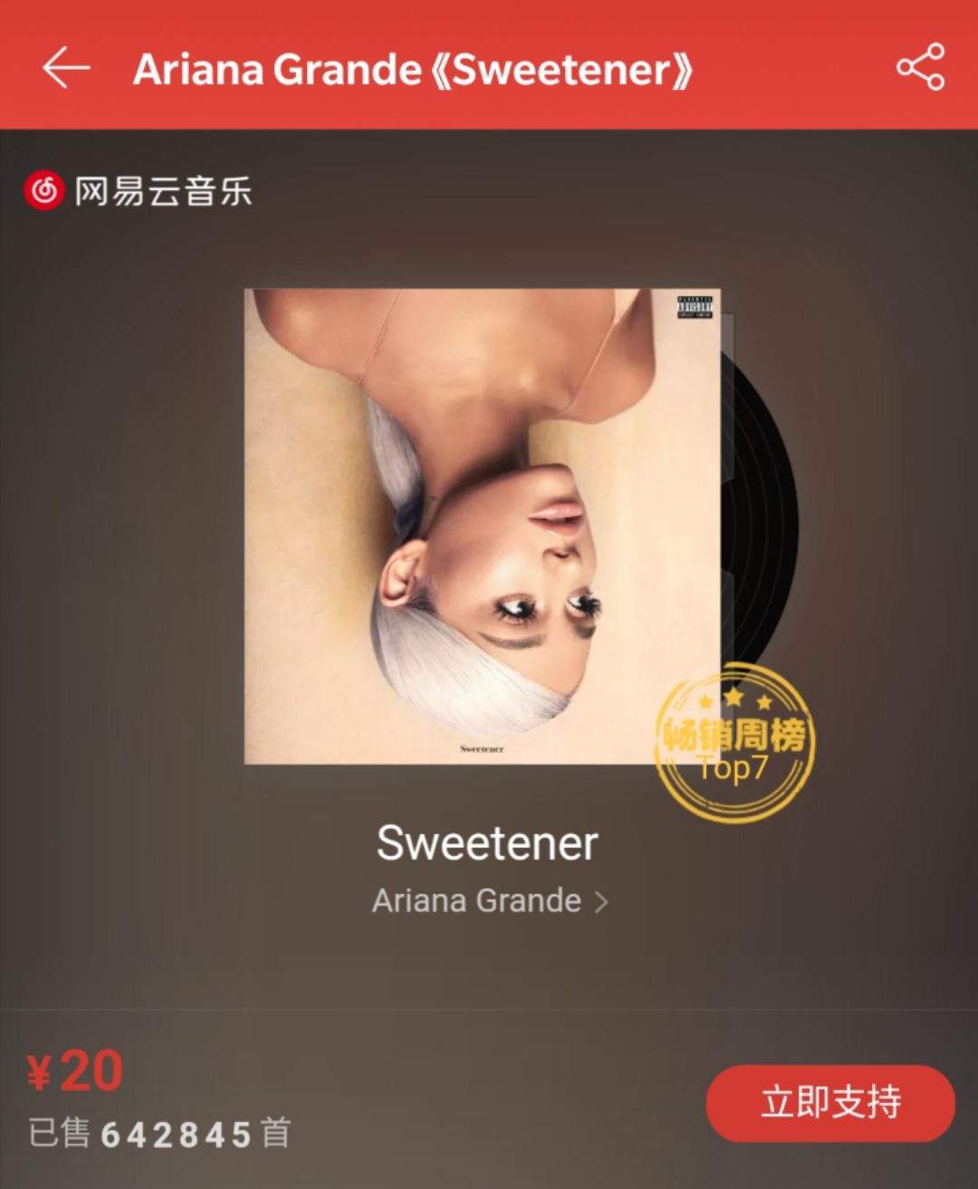 整张专辑发布之后,在最新一期美国Billboard专辑榜上,《Sweetener》以首周23.1万的总销量、12.7万的实销,空降冠军,收获个人第三张冠军专辑;同时,超过她上张新专《Dangerous Woman》17.5万张的首周销量,创下她职业生涯的最高首周专辑销量。