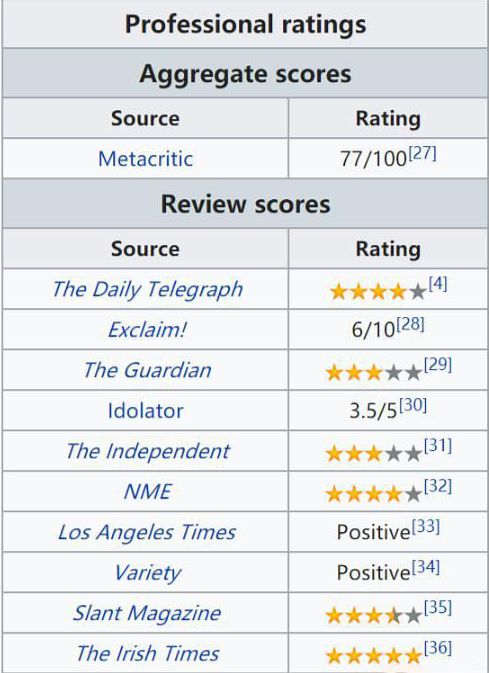 不过,根据国外权威音乐网站给出的评分来看,尽管仍有提升空间,但这张专辑依然得到了主流媒体正向的评价。最差的Exclaim!和The Guardian等也给到了及格的分数,The Irish Times ,NME,Pitchfork等更是给出四星以上的分数,整体来看综合评价已经高达80分。