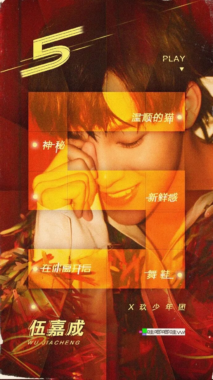 毕业于星海音乐学院的伍嘉成,2015年参加浙江卫视才艺养成节目《燃烧吧少年》团队出道,现在担当“X玖少年团”队长、主唱。