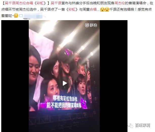 虽然吴千语说要放下介段感情不太容易,8过人家的心情似乎丝毫不受影响,在承认分手当晚还去看了周董的演唱会,更被选中和小公举合唱了一首《彩虹》↓